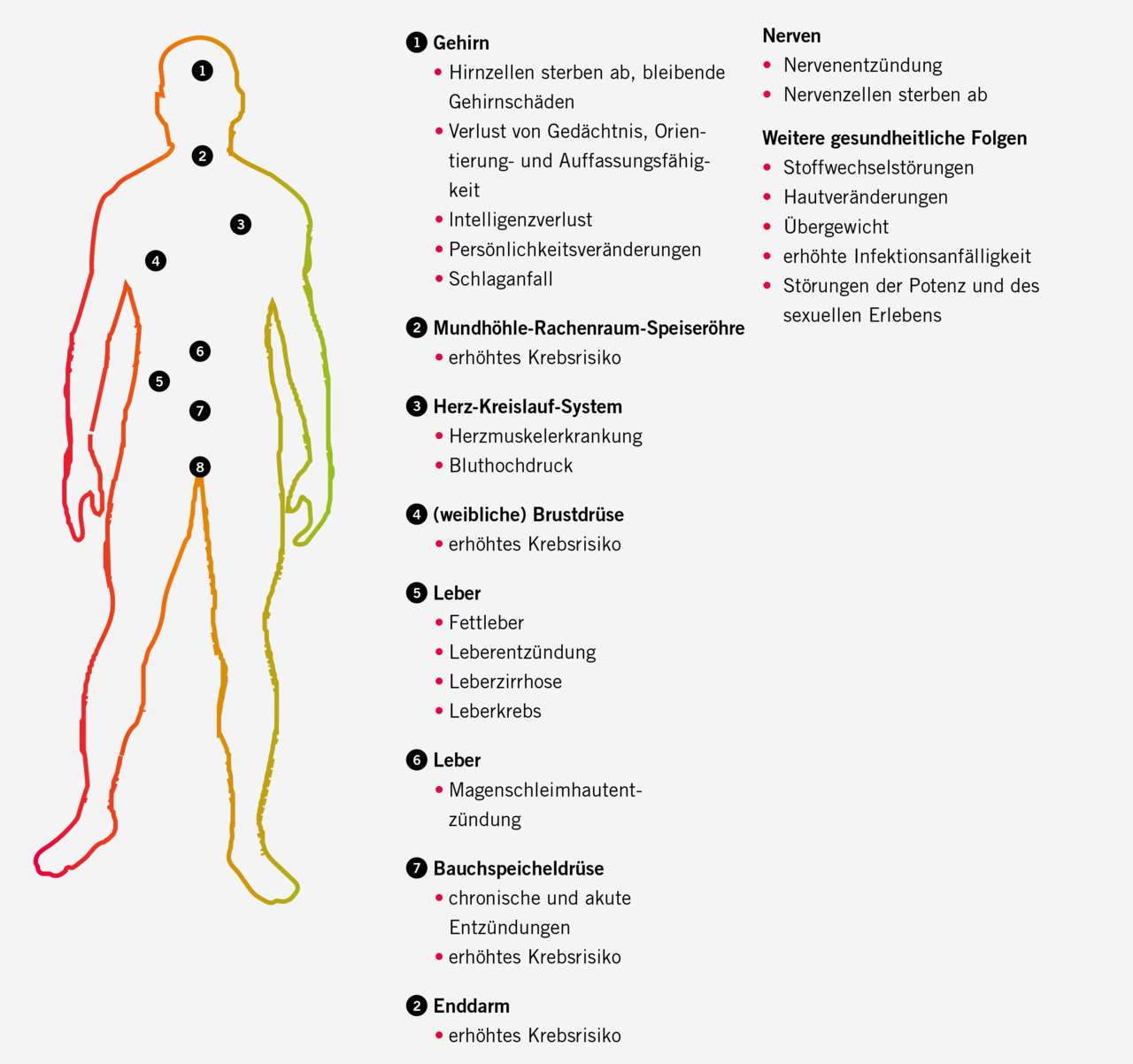 Schon während man ihn trinkt, greift Alkohol Zellen im Mund- und Rachenraum an. Die Gefahr von Krebserkrankungen der Leber, des Darms, im Bereich von Mund- und Rachenhöhle, des Kehlkopfes und der Speiseröhre steigt. Bei Frauen ist zudem das Risiko erhöht, an Brustkrebs zu erkranken.